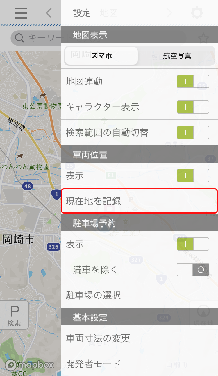 駐車した位置で[現在地を記録]を押すと駐車した位置に