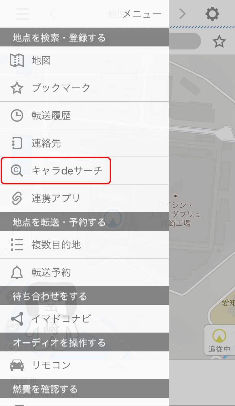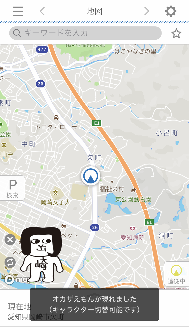 [キャラdeサーチ]を選択し、リストから任意のキャラクタを選ぶとご当地キャラが出現します。