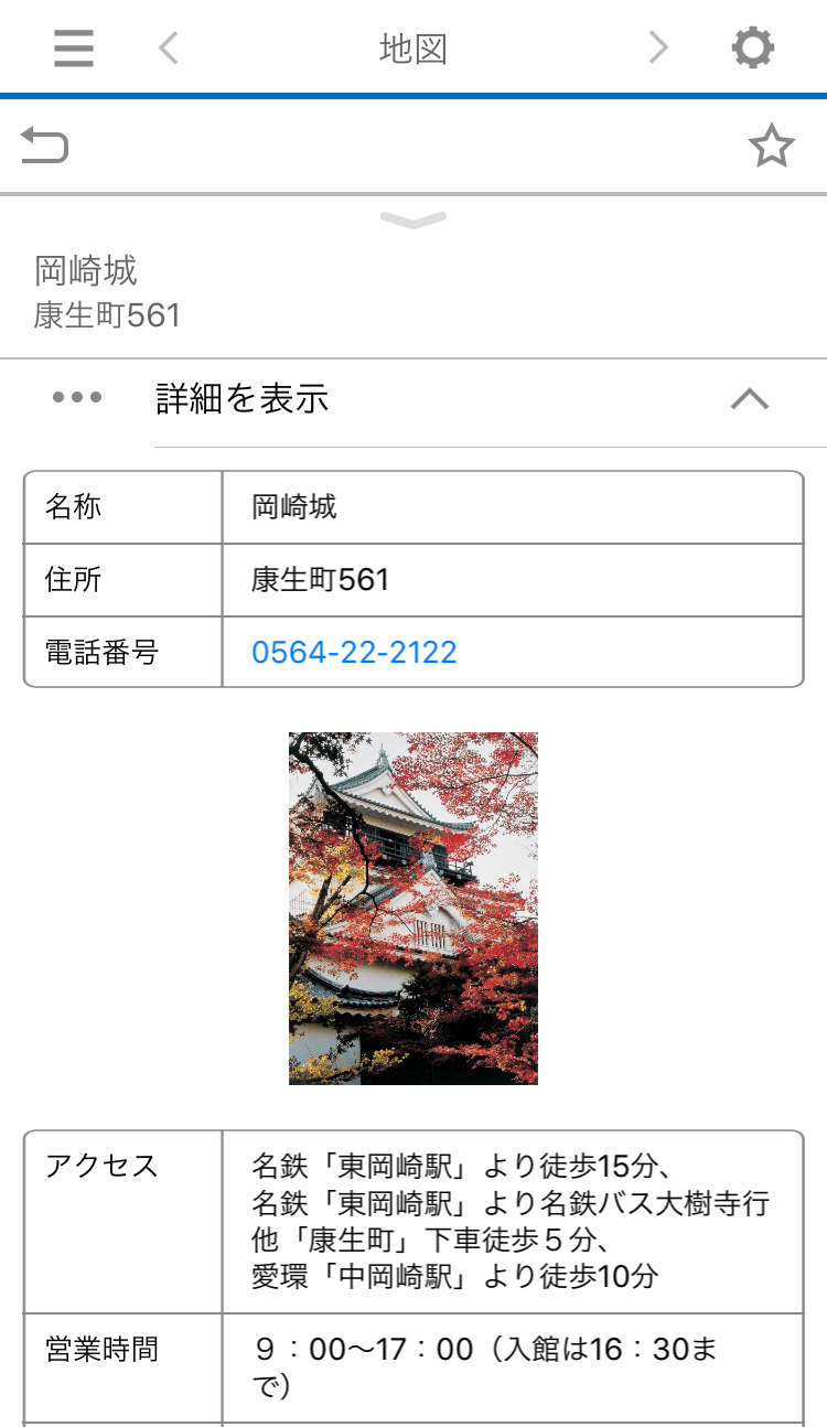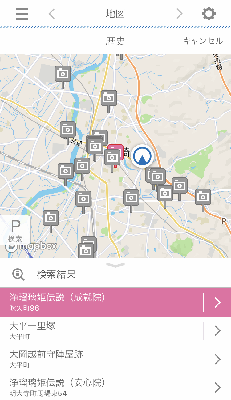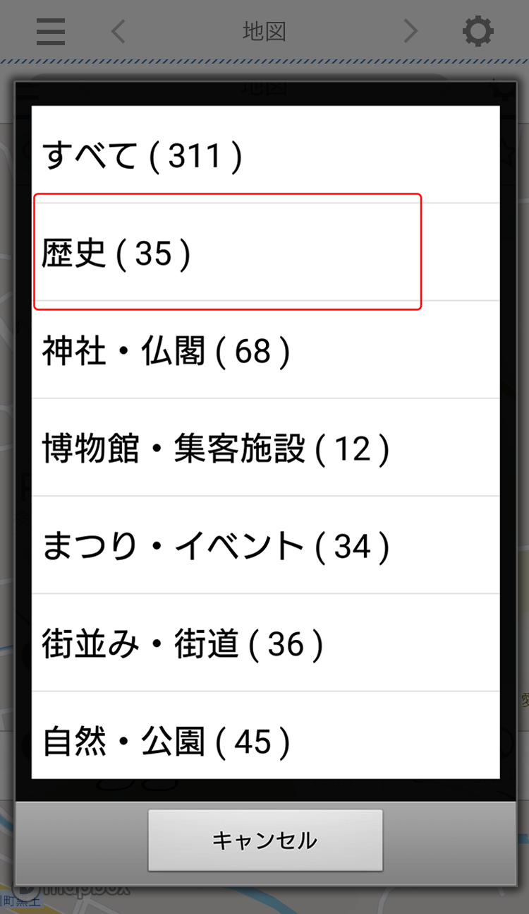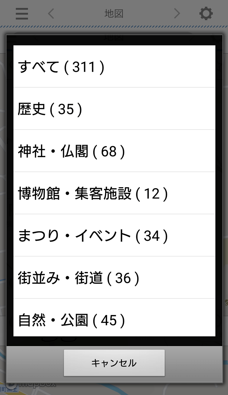 3任意のメニューにタッチすると地図上に観光スポットが表示されます。