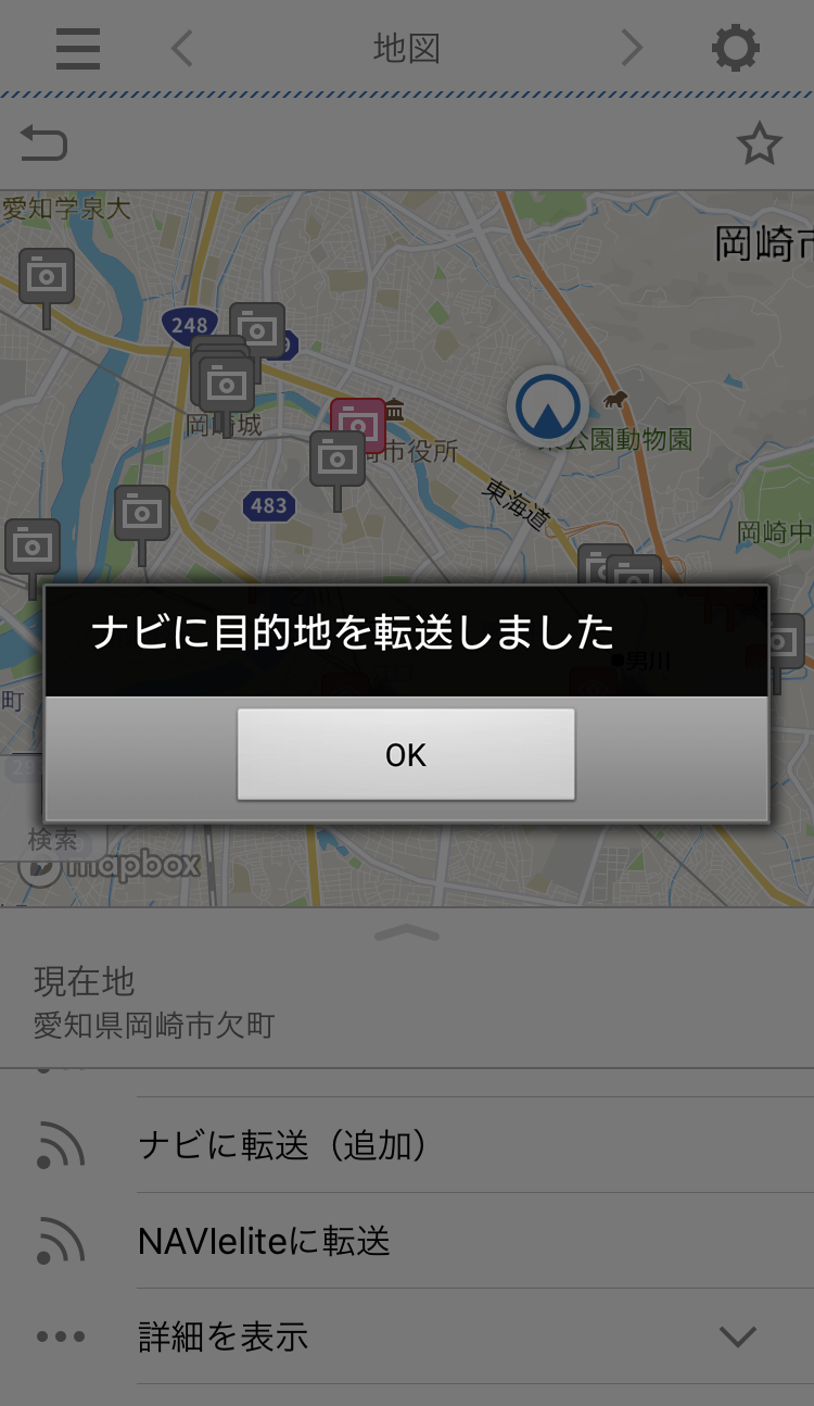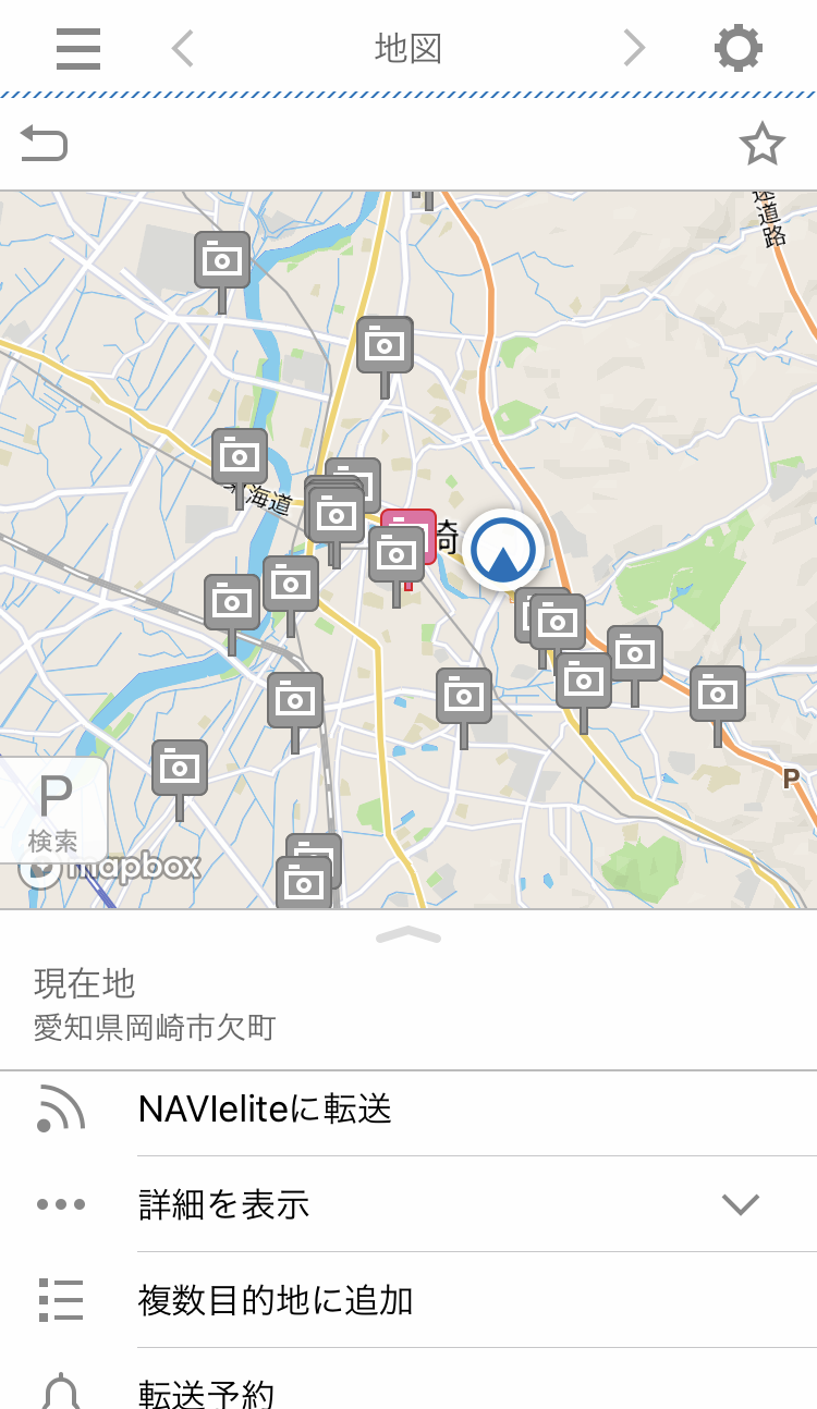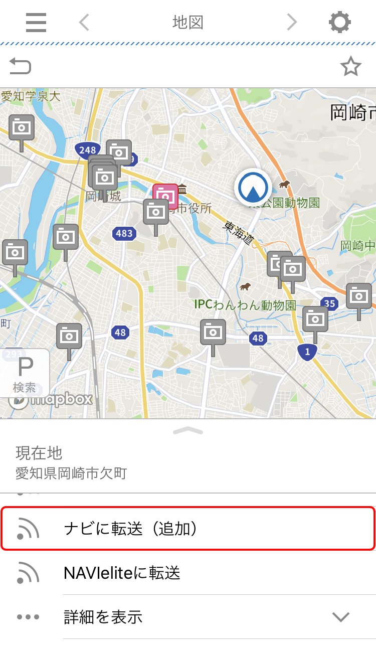 [ナビに転送]を押すとナビに地点の転送ができます。