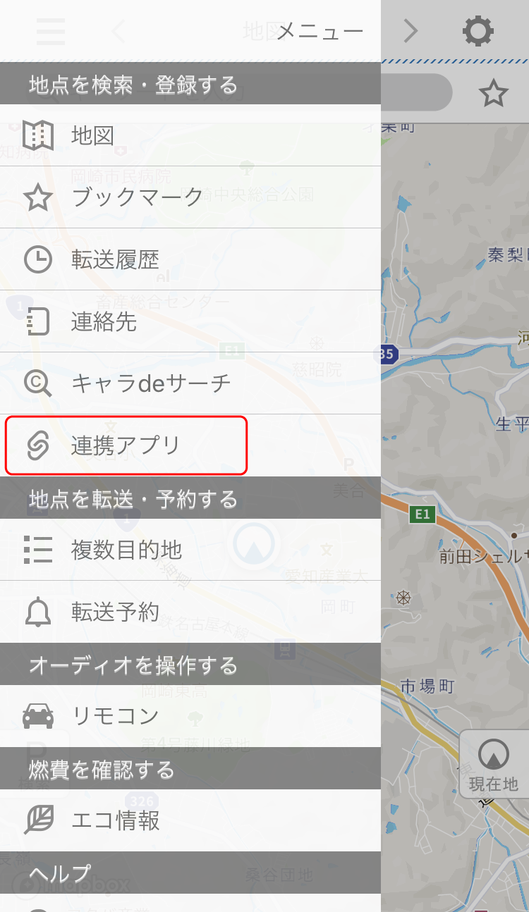 連携しているアプリから、周辺のおすすめ情報を調べたり、目的地に設定することができます。