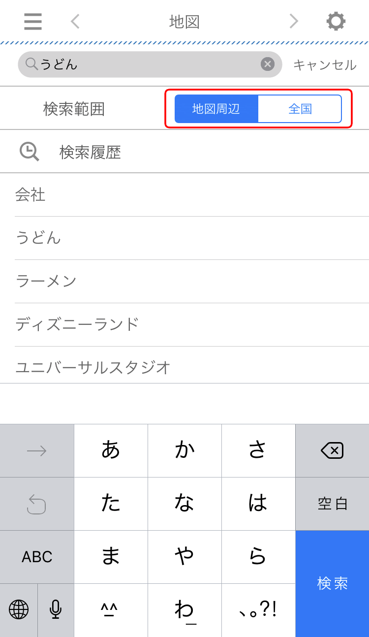 検索バーを押すと、キーボードが表示されます。キーワードを入力し、検索範囲を指定して検索します。