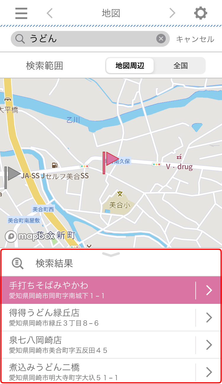2検索した地点にピンがセットされ、画面下に
