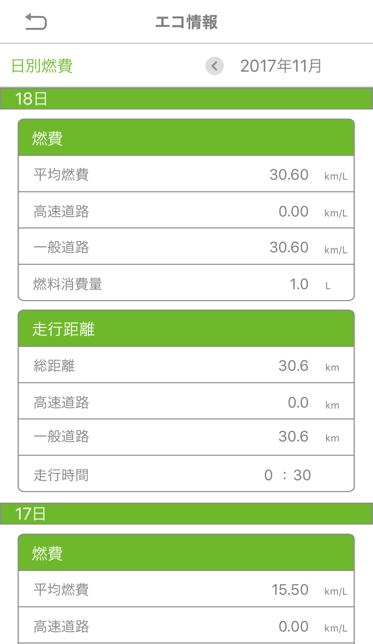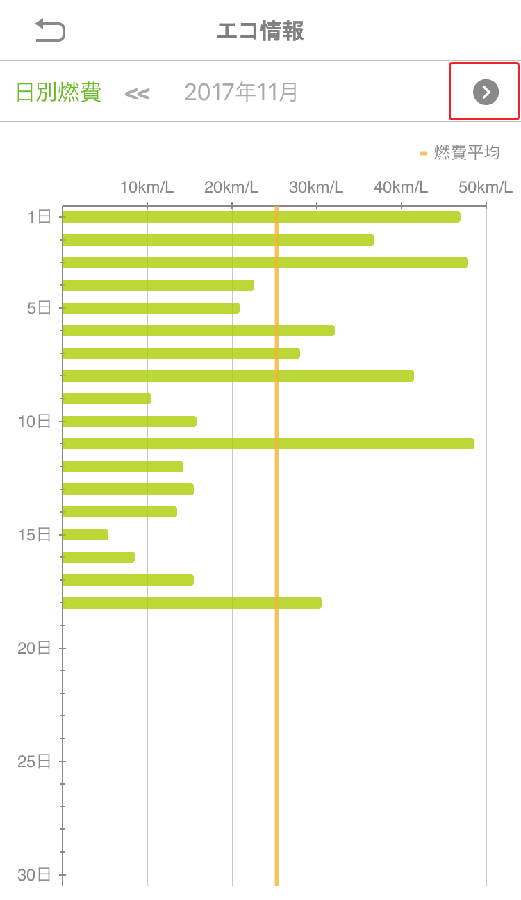 日毎の燃費情報を閲覧できます。 ボタンを押すと詳細な燃費情報を確認できます。