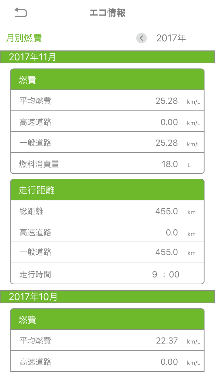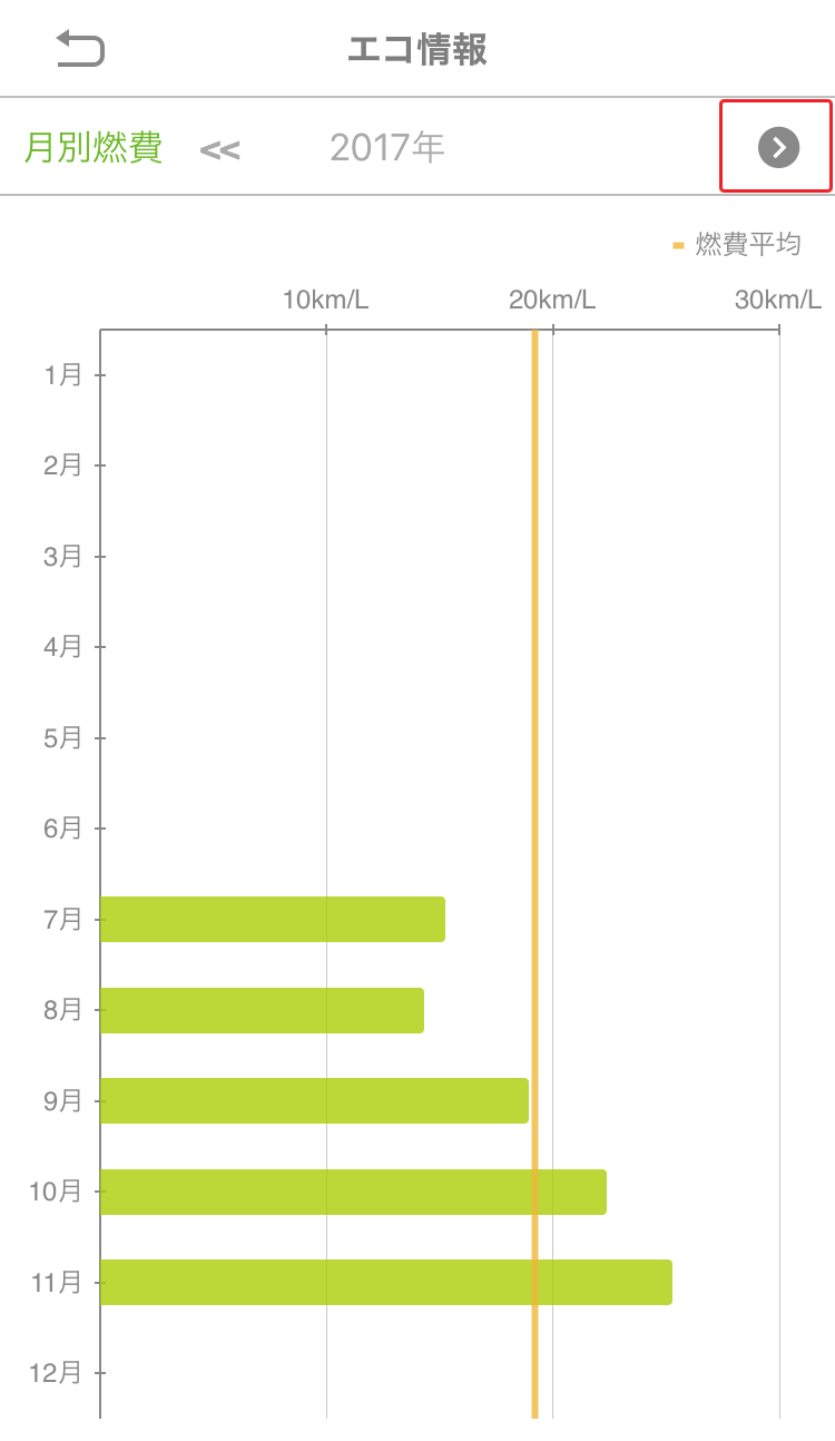 月毎の燃費情報を閲覧できます。 ボタンを押すと詳細な燃費情報を確認できます。
